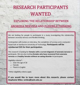 Researchers at Swinburne University of Technology are seeking participants with a current or past diagnosis of anorexia nervosa, and healthy participants without a diagnosis of an eating disorder to take part in research investigating flexible thinking. Contact Stephanie Miles via email for further information: smiles@swin.edu.au