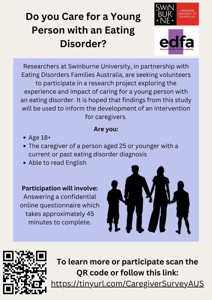 Researchers at Swinburne University, in partnership with Eating Disorders Families Australia, are seeking volunteers to participate in a research project exploring the experience and impact of caring for a young person with an eating disorder, in addition to caregivers’ needs and experiences.