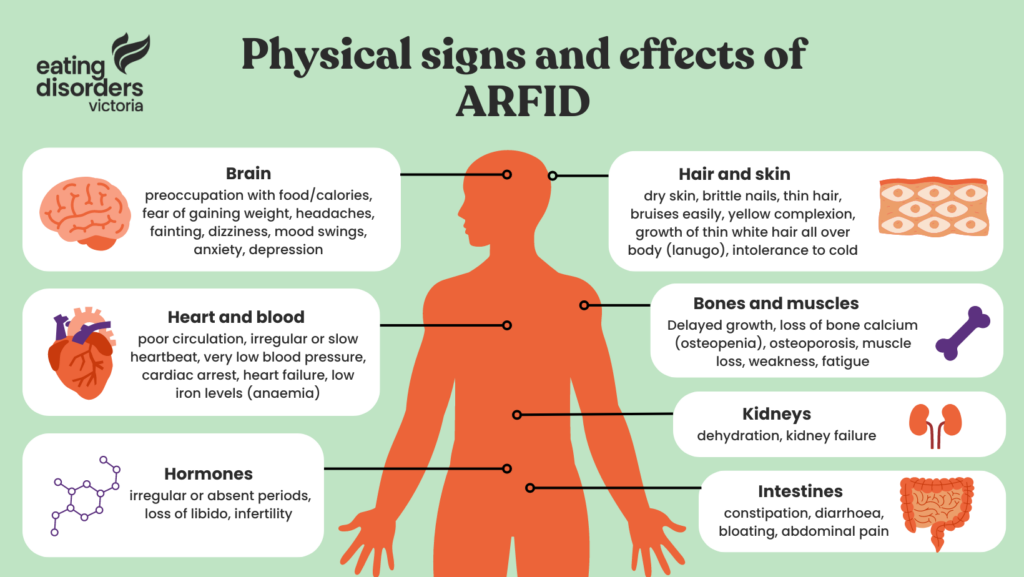 The food avoidance and restriction that define ARFID can lead to medical or mental health consequences that further exacerbate food avoidance and restriction and serve to maintain the illness. ARFID is persistent, more severe, can involve the restriction of both familiar and new foods, and has significant physical and mental health consequences.