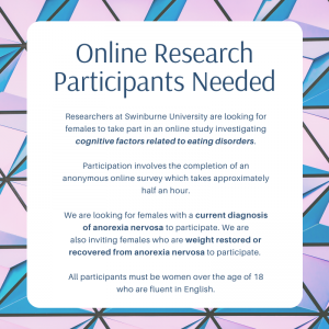 Researchers at Swinburne University of Technology are seeking females with a current or past diagnosis of anorexia nervosa to take part in anonymous online research investigating the relationship between various cognitive factors and anorexia nervosa.